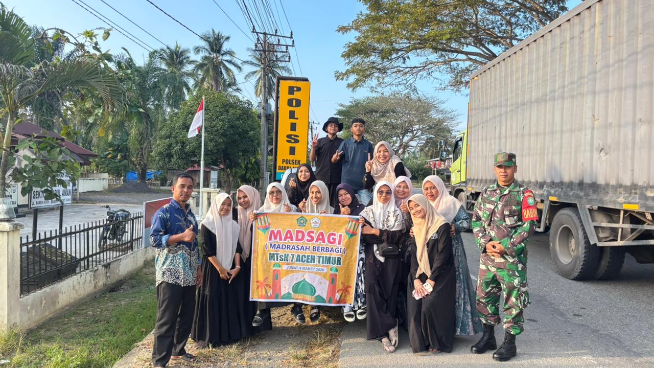 MTsN 7 Aceh Timur kembali melaksanakan kegiatan sosial melalui program MADSAGI (Madrasah Berbagi) dengan membagikan takjil kepada masyarakat yang melintas di depan jalan madrasah. Kegiatan ini dilaksanakan pada hari ini sebagai bentuk kepedulian dan kebersamaan keluarga besar madrasah dalam berbagi keberkahan di bulan suci Ramadan.