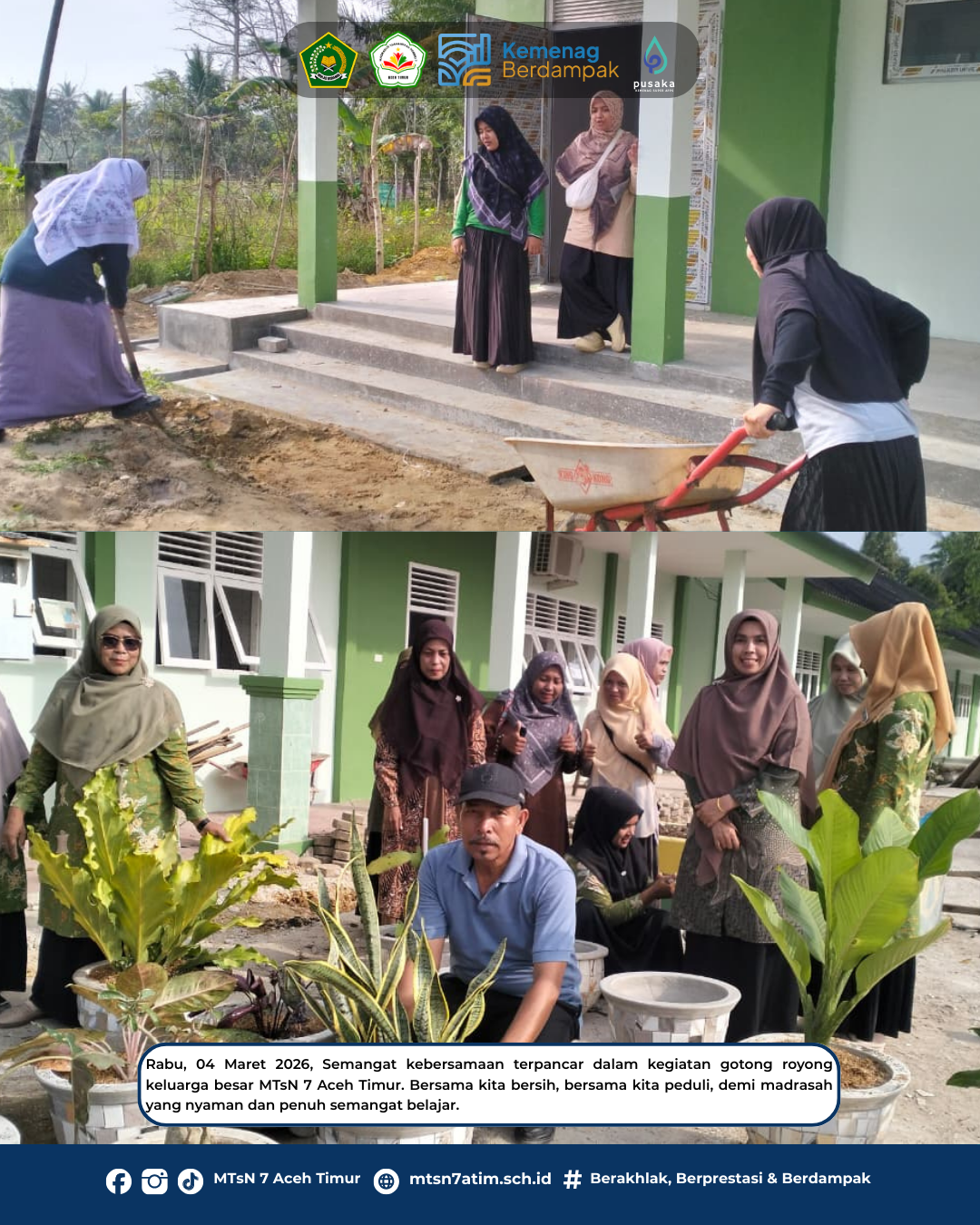 Pada Rabu, 04 Maret 2026, keluarga besar MTsN 7 Aceh Timur melaksanakan kegiatan gotong royong sebagai bentuk kepedulian terhadap kebersihan dan kenyamanan lingkungan madrasah. Kegiatan ini berlangsung dalam suasana bulan suci Ramadan, sehingga pelaksanaannya dilakukan dengan penuh kesadaran dan keikhlasan.
